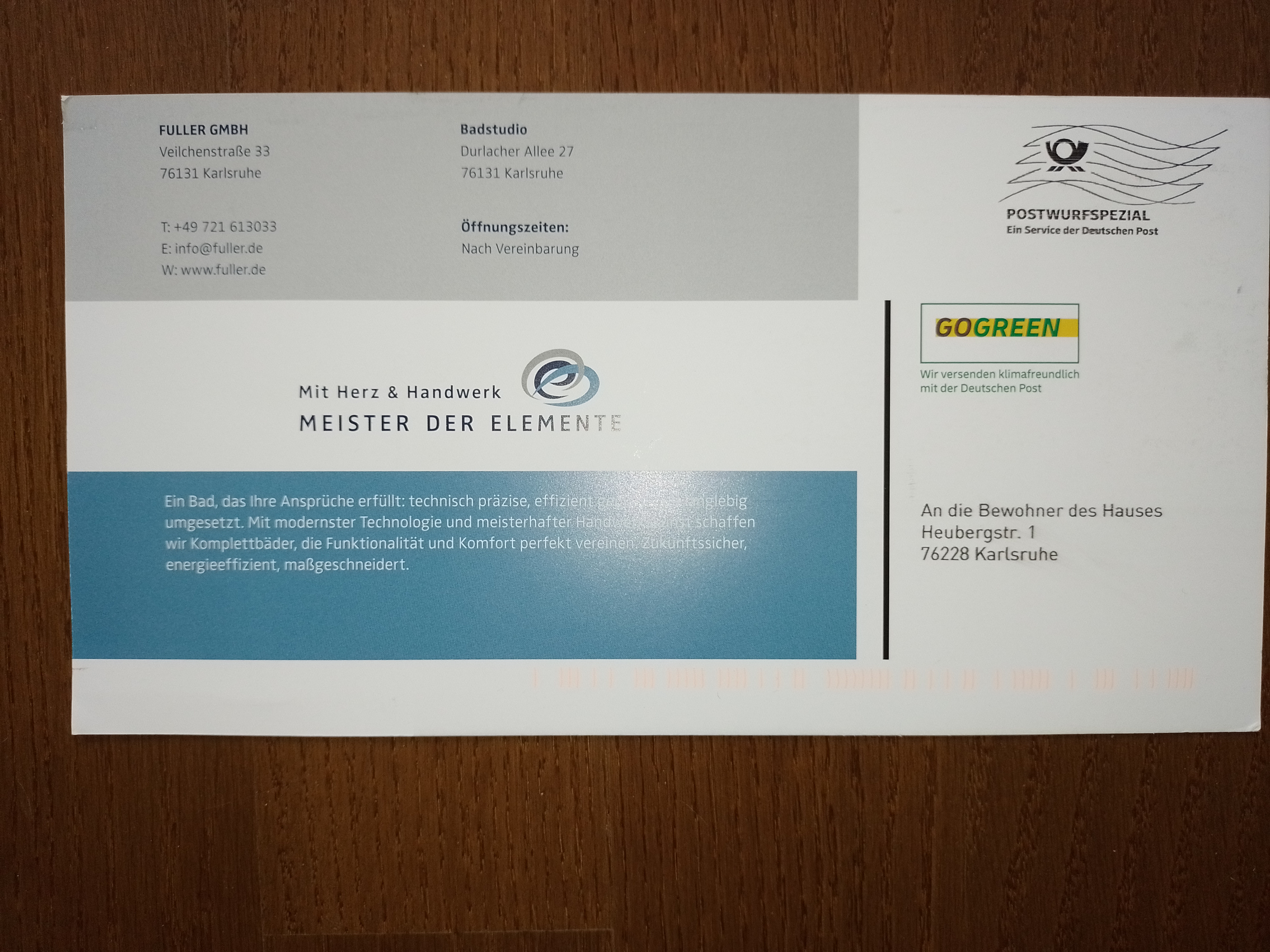 heute lag eine Karte in meinem Briefkasten, Scan und Foto anbei. Aus dem „Postwurfspezial – Ein Service der Deutschen Post“ und den orangefarbenen Codes (nur im Foto sichtbar) erschließt sich für mich, dass dabei eine Verarbeitung personenbezogener Daten stattfindet, über die nicht informiert wird. Ich beschwere mich daher nach Artikel 77 DSGVO über die Deutsche Post wegen fehlender Informationen nach Artikel 14 DSGVO. M.W. ist eine Verarbeitung bei fehlenden Informationen nach der Rechtsprechung des EuGH insgesamt rechtswidrig.